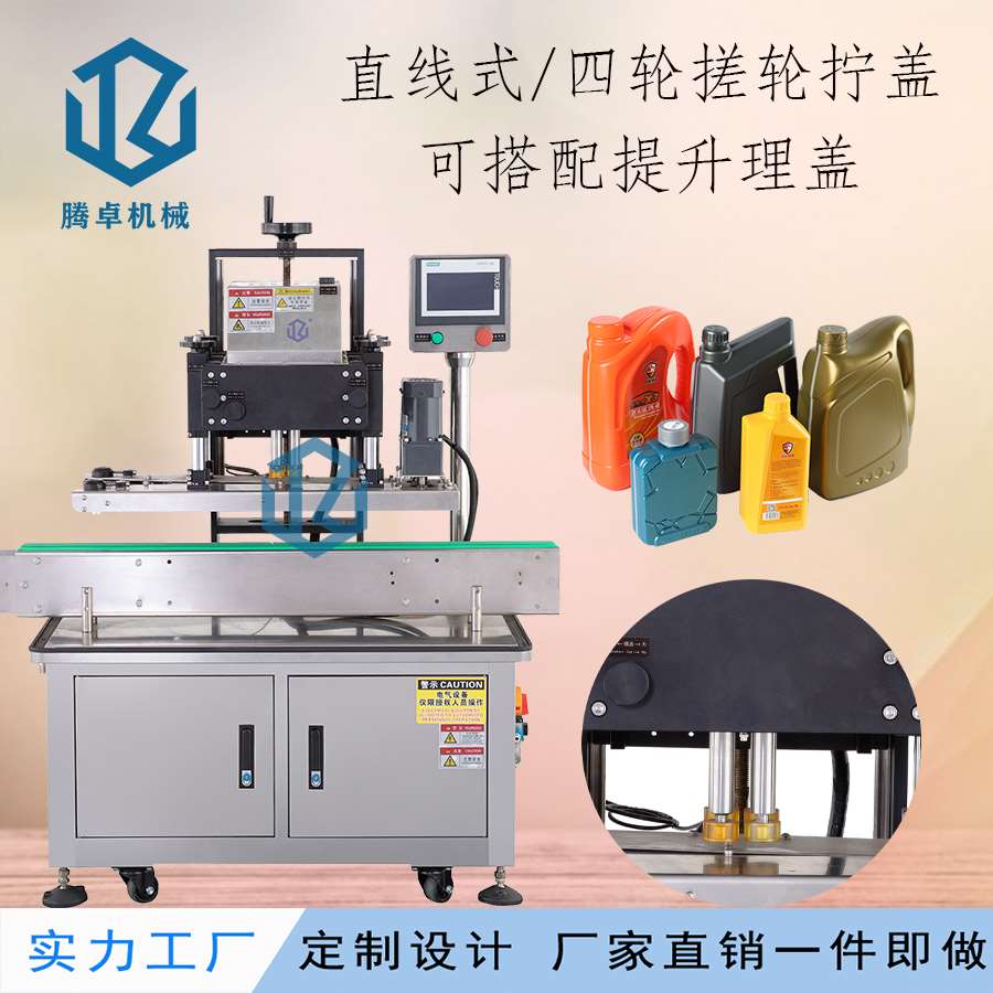 本機(jī)主要適用于螺絲紋平頭塑料蓋旋蓋擰緊,例:潤(rùn)滑油桶、礦泉水瓶、藥瓶、日化用品、飲料瓶等。調(diào)節(jié)簡(jiǎn)單,使用方便??杉嫒荻喾N瓶子蓋子。
